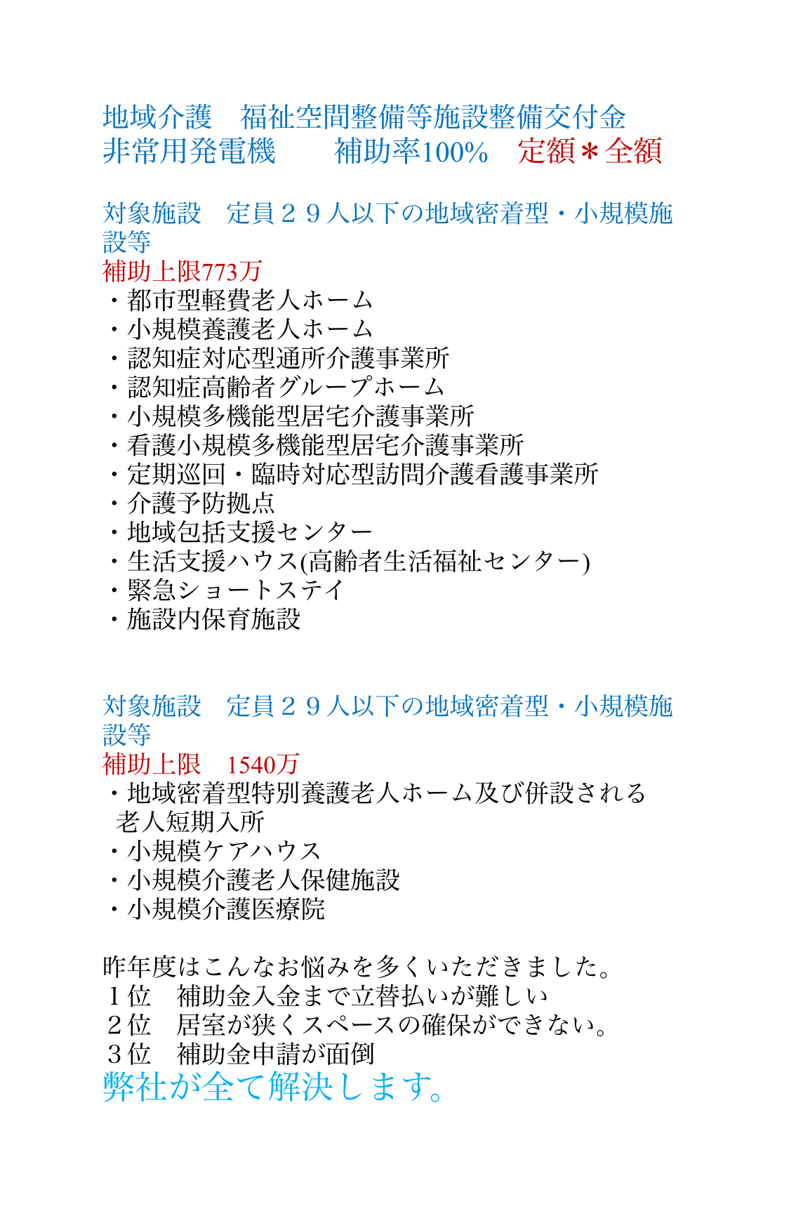 非常用発電を無料で導入できます 投稿者: erde2026年2月3日2026年2月3日Information ※上限枠で終了します。 小規模多機能型居宅介護・看護小規模多機能型居宅介護施設一覧 598509270367207769_260101shoukibo